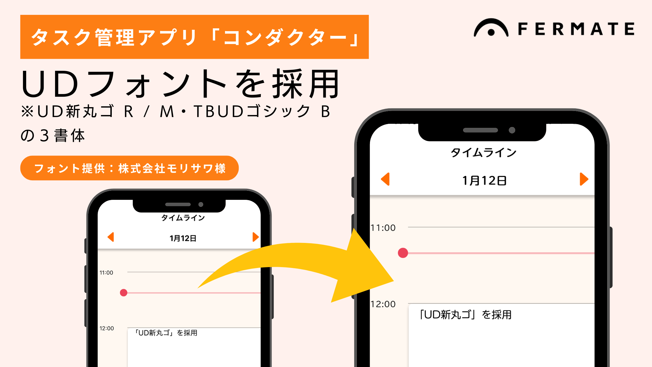 | 詳細 | 発達障害当事者の職場環境を改善するアプリケーション「コンダクター」にUDフォントを採用。多くの方に読みやすく分かりやすいデザインを目指すフォントとアプリの設計思想がマッチし採用に至りました。 |