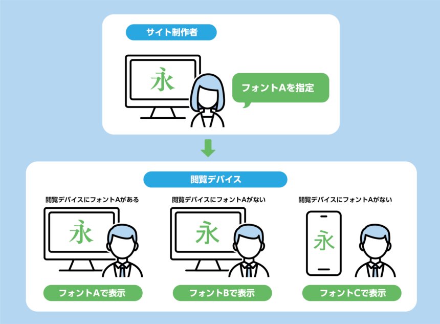 通常のWebサイトでは、サイトを閲覧する側のPCやスマホなどの端末に入っているフォントで文字が表示されます。